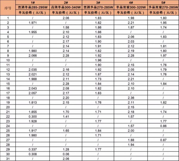 标段3一共23家企业参与报价,多晶270-285W组件最低报价1.71元/瓦,最高报价1.96元/瓦,均价1.834元/瓦,大部分集中在1.82-1.92元/瓦上下。根据PV Infolink最新报价,目前多晶275W组件均价在1.72元/瓦左右。此次中国能建招标的多晶普通组件主要集中在275W、280W两个功率档位,从各家报价来看是要高于目前市场均价的。