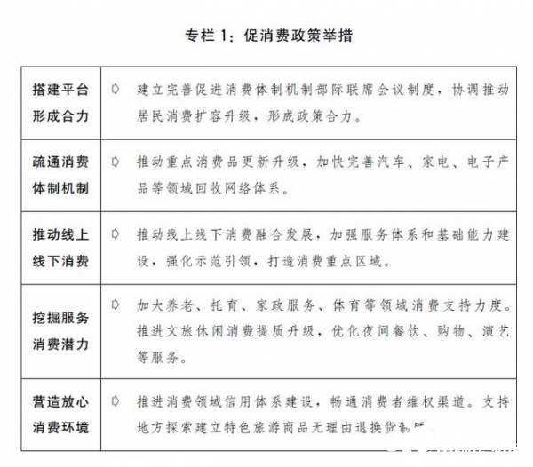 一是释放消费潜力。在防控措施到位前提下,有序推动各类商场、市场复市复业,促进线下消费加速回补。培育壮大线上消费,推进互联网和各类消费业态深度融合。促进教育、医疗、养老、家政、文旅、体育等服务消费线上线下融合发展,进一步支持依托互联网的外卖配送、网约车等新业态。发展大健康产业。扩大电商、快递进农村覆盖面,畅通工业品下乡、农产品进城渠道。加速5G网络建设和场景应用,完善新型基础设施布局,推动超高清视频、虚拟现实等新兴消费。积极扩大汽车消费,允许进口尾气排放实测结果达到国六标准的平行进口汽车。对京津冀等重点地区淘汰国三及以下排放标准柴油货车给予适当奖补。加大汽车、绿色智能家电等消费金融支持。鼓励有条件的地区实施家电以旧换新补贴政策。加快废旧家电回收体系建设。扩大智能产品、定制化产品和绿色产品供给,促进绿色消费发展。培育建设国际消费中心城市,因地制宜形成若干区域消费中心。积极发展“智慧商圈”,加快建设新型文旅商业消费聚集区。加快恢复乡村旅游和休闲农业。鼓励夜间经济发展。有序放宽低空空域限制,加快通用航空网络建设,推动通用航空发展。加强国家物流枢纽、国家骨干冷链物流基地和商品流通网络建设,推动冷链物流、智慧物流、国际物流、供应链发展。推进电子商务与快递物流协同发展。深入推进步行街改造提升。强化消费信用体系建设,大力整治伪劣商品、侵权仿冒等问题,加大农村商品流通市场秩序监管力度,健全消费维权法律制度和政策体系,营造安全放心消费环境。