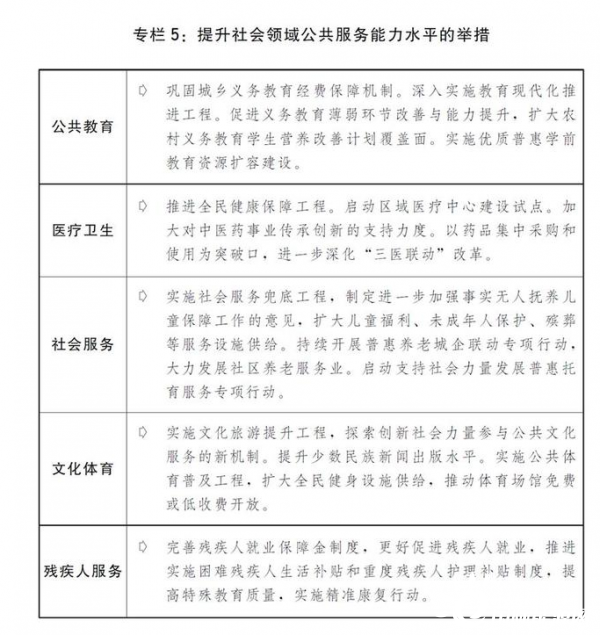 五是持续提高公共服务水平。推动国家基本公共服务标准出台,推进基层服务机构标准化试点。稳定教育投入,优化投入结构,缩小城乡、区域、校际差距。巩固城乡义务教育经费保障机制,积极化解城镇义务教育学校大班额,加强乡镇寄宿制学校和乡村小规模学校、县城学校建设,完善随迁子女义务教育入学政策。办好特殊教育、继续教育。多渠道扩大普惠性学前教育资源,支持深度贫困地区优质普惠学前教育资源扩容建设,帮助民办幼儿园纾困。加快实施高中阶段教育普及攻坚,持续改善贫困地区学校基本办学条件。稳步发展普通本科教育和研究生教育。支持中西部高校发展。扩大高校面向农村和贫困地区招生规模。普通高等教育本专科招生920万人,研究生招生111.4万人。大力推进国家产教融合建设试点。加强教师队伍建设。推进教育信息化。积极应对人口老龄化,支持社会力量发展普惠养老、普惠托育服务。繁荣发展哲学社会科学。加强文物保护利用和非物质文化遗产传承。继续实施文化旅游提升工程,积极推动黄河文化保护传承弘扬,加快推进重大文化设施项目建设,推动全域旅游、乡村旅游和红色旅游发展。积极推进海南国际旅游消费中心、横琴国际休闲旅游岛、平潭国际旅游岛等建设。加快推进“互联网+旅游”发展。深入开展“领跑者”行动,全面推进家政服务业提质扩容。推进冬奥会场馆建设。实施应急管理能力标准化建设,加快推动战略应急物资储备安全管理体制机制改革。加强自然灾害监测预警,加快自然灾害防治重大工程实施,做好防灾减灾和救灾工作。加强和创新社会治理,健全社区管理和服务机制,提升基层应急能力。深化公共法律服务体系建设。加强和改进食品、药品安全监管。严格落实安全生产责任制,做好安全生产和隐患排查,坚决防止各类重特大事故灾难发生。