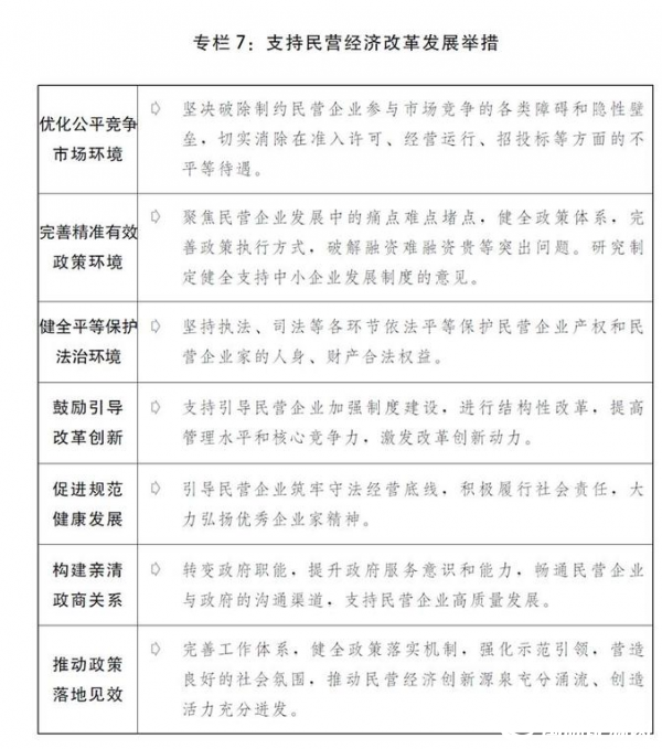 二是建设高标准市场体系。实施新时代加快完善社会主义市场经济体制的意见。制定实施高标准市场体系建设行动方案。构建更加完善的要素市场化配置体制机制,开展要素市场化配置综合改革试点。全面实施市场准入负面清单制度,以服务业为重点开展放宽市场准入试点,探索实施市场准入负面清单许可事项审批在线监管和综合评估。推动地方建立市场准入隐性壁垒台账,重点破除民营企业特别是中小微企业准入障碍。研究制定竞争政策的指导意见,修订完善公平竞争审查制度实施细则。强化对各类产权平等保护的法律规定。健全支持民营经济发展的法治环境,保护民营企业、民营企业家合法财产权和经营权。加强和改进反垄断和反不正当竞争执法,强化企业商业秘密保护。建立健全知识产权侵权惩罚性赔偿制度,加大知识产权执法力度,加强专利转化和应用。