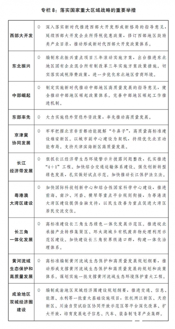 一是落实落细重大区域发展战略。落实区域协调发展新机制,持续推进西部大开发形成新格局,支持东北地区全面振兴全方位振兴,健全中部地区崛起政策体系和工作机制,继续推动东部地区率先发展。纵深推进京津冀协同发展,加快实施雄安新区重点建设项目,完善北京非首都功能疏解政策体系。大力推进长江经济带生态环境突出问题整改和系统性保护修复,加快构建综合交通运输体系,促进内河船舶改造。推动粤港澳大湾区基础设施互联互通,有序开展国际科技创新中心建设,加快横琴、河套等重大合作平台建设。高标准建设长三角生态绿色一体化示范区,推动长三角交通一体化更高质量发展,建设虹桥国际开放枢纽。抓紧做好黄河流域生态保护和高质量发展规划纲要编制和出台实施工作。大力支持成渝地区双城经济圈建设,打造全国高质量发展的重要增长极。积极推进西部陆海新通道建设。深化对口支援。支持少数民族和民族地区加快发展。推动国家级新区、开发区等功能平台创新提升发展,加快推进资源型地区经济转型和老工业城市更新改造。推动山西开展能源革命综合改革试点。继续推进承接产业转移示范区建设,在具备条件的内陆城市打造一批高端制造业基地。制定发展海洋经济加快建设海洋强国的意见。完善主体功能区战略和制度,编制《全国国土空间规划纲要(2021-2035)》。