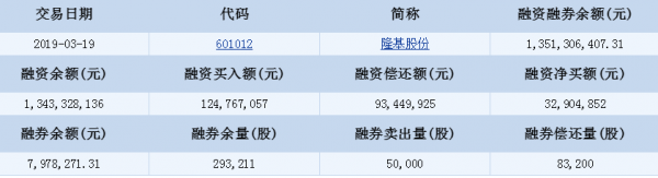 隆基股份2019-03-19融资融券信息显示,隆基股份融资余额1,343,328,136元,融券余额7,978,271.31元,融资买入额124,767,057元,融资偿还额93,449,925元,融资净买额32,904,852元,融券余量293,211股,融券卖出量50,000股,融券偿还量83,200股,融资融券余额1,351,306,407.31元。隆基股份融资融券详细信息如下表: