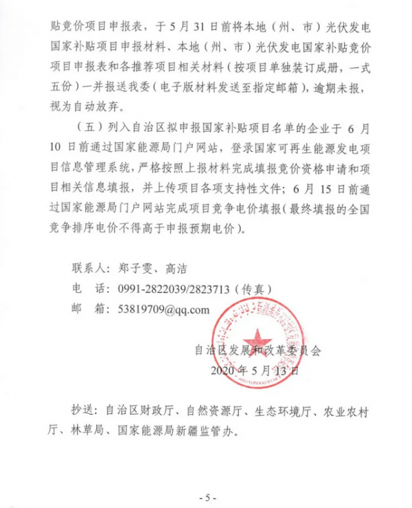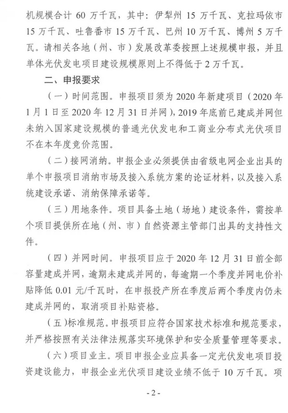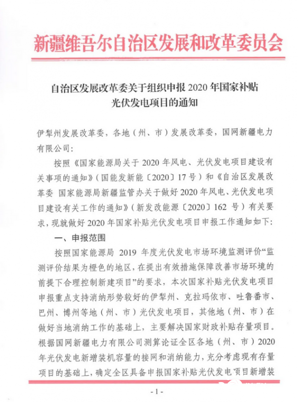 5月13日,新疆自治区发展改革委发布《关于组织申报2020年国家补贴光伏发电项目的通知》。