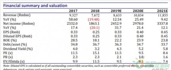 业务多元化发展。公司2018年收入同比下滑19.5%至77亿港币,主要由于来自EPC业务及光伏玻璃板块收入下滑。来自光伏玻璃板块收入2018年约56亿港币(同比降3.2%),占总收入约72.5%。受益于新增装机带来的发电量贡献,来自光伏电站业务收入同比增30.3%至19亿港币。另外来自光伏EPC收入2018年达1.9亿港币,占总收入约2.5%。我们预计2019年公司总收入增至86亿港币(同比增12.5%),主要得益于光伏玻璃板块收入增长及光伏电站板块持续贡献稳定业绩。
