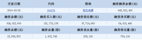 阳光电源2019-02-26融资融券信息显示,阳光电源融资余额624,923,600元,融券余额23,598,853元,融资买入额151,733,105元,融资偿还额97,714,660元,融资净买额54,018,445元,融券余量1,932,748股,融券卖出量838,126股,融券偿还量759,100股,融资融券余额648,522,453元。阳光电源融资融券详细信息如下表: