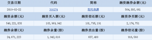 阳光电源2019-02-22融资融券信息显示,阳光电源融资余额540,221,838元,融券余额24,671,223元,融资买入额103,969,942元,融资偿还额101,795,191元,融资净买额2,174,751元,融券余量1,942,616股,融券卖出量657,400股,融券偿还量916,560股,融资融券余额564,893,061元。阳光电源融资融券详细信息如下表: