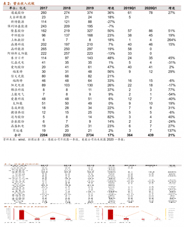 2019年收入增长27%。2020Q1收入增长13%。2019年光伏产业27家上市公司合计实现销售收入2734亿元,同比增长17%,2020年Q1已披露数据的21家上市公司合计实现销售收入439亿元,同比增长21%。