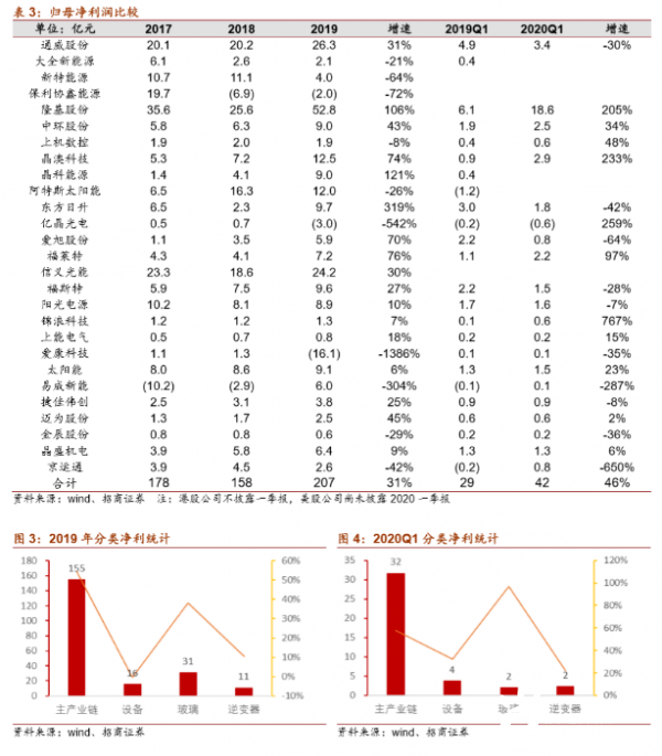 2019年净利增速31%,2020Q1净利增速46%。2019年27家上市上市公司合计实现归母净利润207亿元,同比增长31%。2020年Q1已披露数据的21家上市公司合计实现归母净利42亿元,同比增长46%,隆基中环两大硅片厂净利占到样本净利的50%。