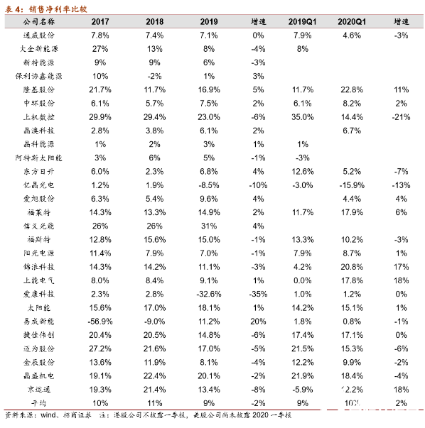 2019年全行业平均销售净利率9%。2019年27家上市公司算数平均销售净利率9%,同比下降2PCT。2020年Q1已披露数据的21家上市公司算术平均销售净利率10%,同比增长1PCT。不同环节不同企业之间差别较大,全行业盈利能力最强的是信义的玻璃、隆基的硅片、晶盛的炉子、通威的硅料。