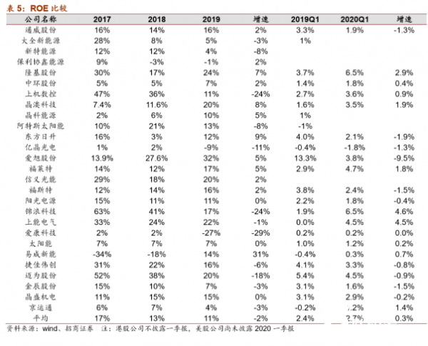 2019年收入净利高增长,2020Q1受疫情冲击阶段性下滑。2019年光伏产业27家上市公司合计实现销售收入2734亿元,同比增长17%;归母净利润207亿元,同比增长31%;平均销售净利率9%,ROE约11%,资产负债率56%。各环节盈利能力最强的分别是通威的硅料、隆基的硅片、通威和爱旭的电池、信义的玻璃、晶盛的炉子。2020Q1受疫情冲击各项指标阶段性下滑。