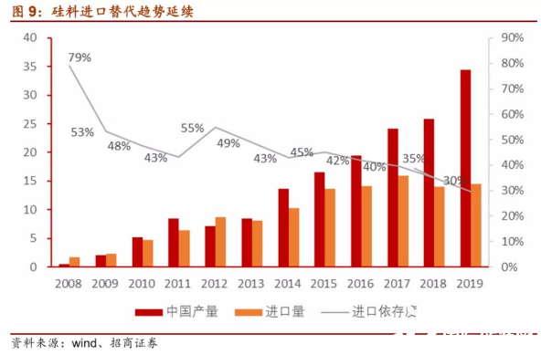 硅料进口依存度30%,替代空间仍较大。2019年海外硅料产量17.5万吨,其中光伏级14.5万吨,电子级3万吨,其中德国产量5.8万吨,韩国5.2万吨、美国3万吨、马来等其他区域3.5万吨。光伏级硅料几乎都出口到了中国,2019年中国硅料需求48.4万吨,进口硅料市场份额30%,同比下降5PCT。