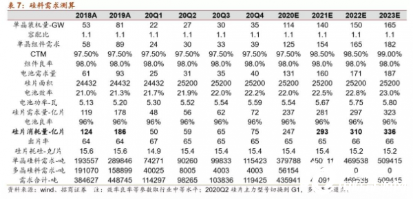 硅料市场向头部企业集中,五大格局基本形成。从硅料品质和完全成本两个维度看,硅料市场大概率集中于国内五大硅料厂。从盈利水平和资金实力来看,通威实力最强,目前正在扩建保山一期和乐山二期各4万吨,到2021年底通威将形成17万吨产能,成为硅料行业龙头。预计2020-2023年硅料供给分别为45.8/45.9/47.8/50.2万吨,当前供给最为宽松,后面随着疫情消退,需求将逐渐恢复,2021年硅料供应将偏紧。