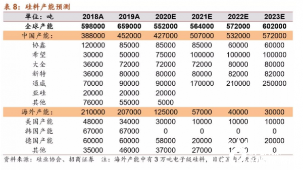 当前硅料名义产能严重过剩,落后产能将加速退出。2020年一季度国内产量10.5万吨,进口3.3万吨,合计13.7万吨,剔除韩华供应量后一季度全球硅料供给12.9万吨,年化供给能力在51.6万吨,远远超过43.6万吨的年度需求,因此预计有8万吨左右的高成本产能将在今年退出。