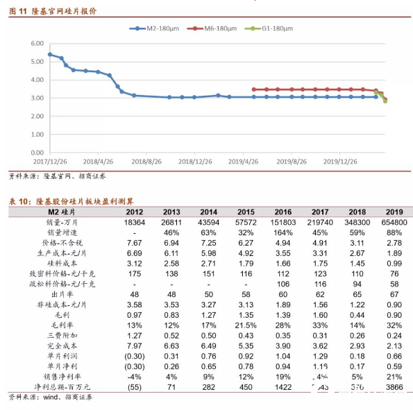 双寡头格局依旧,2019年单晶硅片价格稳定利润丰厚。硅片环节技术壁垒较高,隆基中环双寡头格局依旧,2019年隆基出货35GW,中环28GW,单晶市场规模90GW,两家合计市占率依旧在70%附近。2019年初到年末,光伏产业链单晶致密料价格下跌9%、单晶电池下跌22%,单晶组件下跌23%,但单晶硅片价格全年持平,成为2019年光伏产业供需格局最优利润最好的环节。2019年底隆基单晶硅片毛利率超过35%,接近40%,显著超过其他环节。