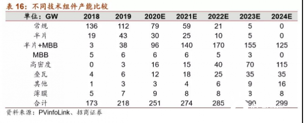 半片+MBB成为主流封装技术。2019年围绕MBB的争论结束,MBB取代5BB成为主流电池印刷工艺,同时半片封装带来5-10W的增益,而成本几乎没有增加,得到广泛应用,MBB+半片成为主流封装工艺。对于210大硅片,由于尺寸较大,主流技术采用3分片5列的封装方式。叠瓦和叠焊有部分企业在推,但应用规模较小。