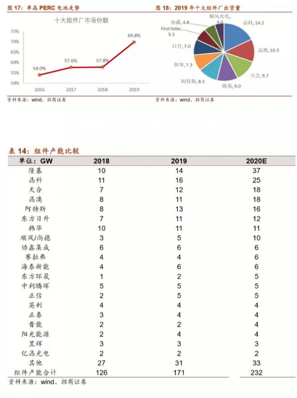 一体化大厂竞争力更强,大规模扩张挤压二三线小厂。组件制造环节技术壁垒和资金壁垒都不高,因此组件产能扩张较为容易,但组件销售渠道差异较大。晶科、晶澳、隆基、日升、天合等大厂凭借全球化的销售渠道、完善的售后服务网络、全球知名的品牌优势以及更有竞争力的价格在全球快速扩张和渗透,集中度还会继续提升。