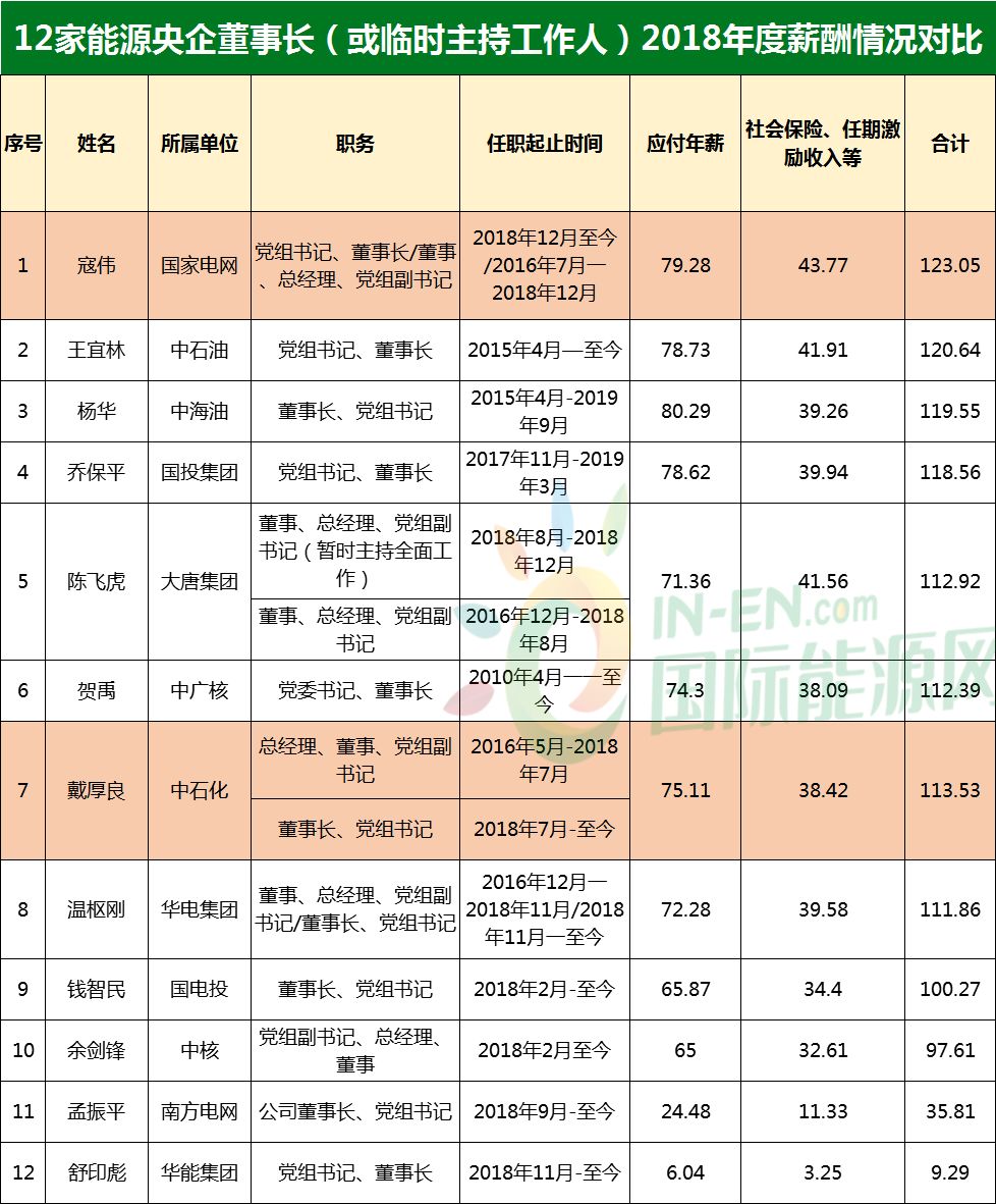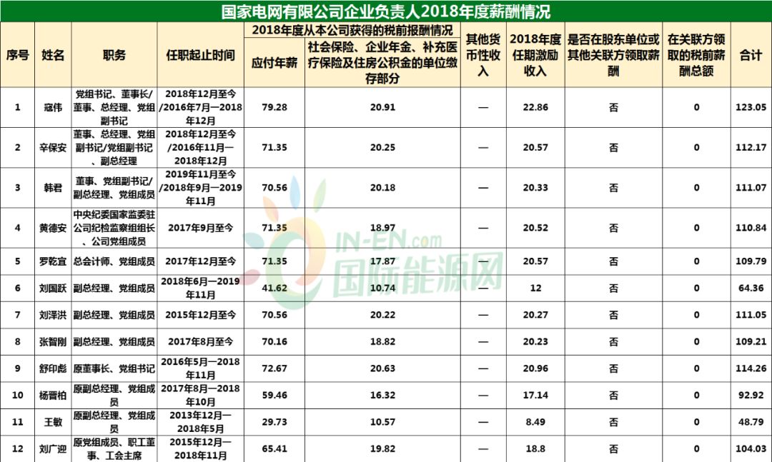 随着2019自然年的结束,各大央企也陆续公布了公司上一年度的企业负责人薪资情况。国际能源网/光伏头条记者共统计了12家主要能源央企,其中包括:五大发电集团、两网、三桶油及两核,单位统一为“万元”,币种为“人民币”。