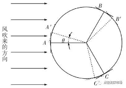 在风场中,每个叶片的迎风面积随着风机的转动而发生变化。所以主轴受到的力矩随着叶片转动而变化。在初始位置,风轮的迎风面积为: