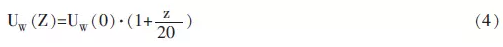 风生流可用速度UW(z)的线性分布来表示,该速度从海表层的UW(0)减少到静水位以下20m 深处的计算公式为: