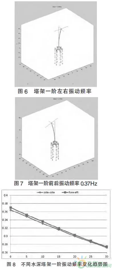 可以看出,随着水深的增加,塔筒的频率有所降低,是造成塔筒变形和受力增大的主要原因,因此在进行塔架和基础设计时,需要根据具体情况调整刚度。