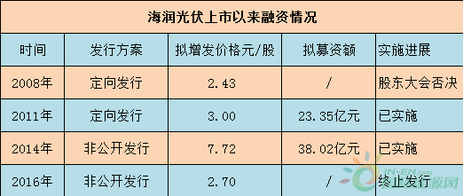 据统计,海润光伏自2003年上市以来累计增发4次,其中成功2次,失败2次。累计实际募资净额为61.37亿元,总派现总额为9.16亿元。最近的一期增发日期在2014年9月,次年9月,参与增发的投资者就已解禁。目前持有公司股票投资者中,绝大多数为散户持有。