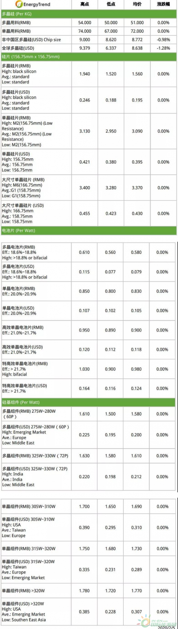 本周组件市场受到疫情影响,国内各省市之间的交通严重受阻,加上开工时间的延期与限制,同时相关辅材欲向海外运输的可能性不高。估计海外组件的价格最先被影响。国内部分则因为整体都在疫情影响范围之内,由上到下都可以相对应地延迟交货或暂缓发货与施工,因而组件出货影响效果不如海外来得明显,整体价格变化会视下周开工后的状况而定。目前海外60片的275W~280W产品维持不变在0.195~0.225USD/W,72片的325W~330W产品维持不变在0.198~0.220USD/W,305W~310W产品维持不变在0.295~0.390USD/W,315W~320W产品维持不变在0.231~0.335USD/W,>320W产品维持不变在0.228~0.385USD/W。国内60片的275W~280W产品维持不变在1.51~1.62RMB/W,72片的325W~330W产品维持不变在1.59~1.63RMB/W,305W~310W产品维持不变在1.63~1.69RMB/W,315W~320W产品维持不变在1.71~1.80RMB/W,>320W产品维持不变在1.76~1.81RMB/W。
