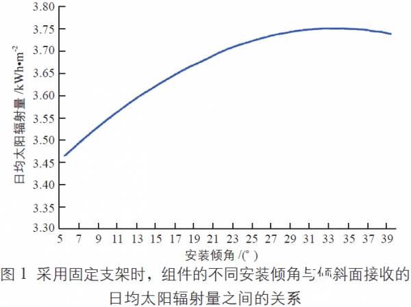根据表1 的数据,通过Retscreen 软件可计算出光伏组件接收的年太阳辐射量最大时所对应的安装倾角,计算时,安装倾角建议从5°开始取值,直到出现最大辐射量值的安装倾角,然后在此值的基础上再选更大的几个角度进行复核,最终得出倾斜面辐射量最大时对应的安装倾角即为此光伏发电系统中光伏组件的最佳安装倾角。采用固定支架时,组件的不同安装倾角与倾斜面接收的日均太阳辐射量的关系如图1 所示。