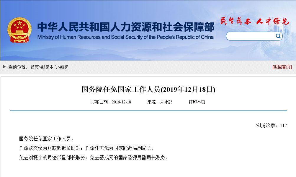 今(12月18日),人力资源和社会保障部官网发布国务院任免国家工作人员公告。
