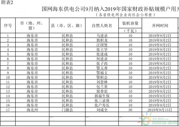 青海9月纳入2019年国补规模的户用光伏项目名单:17户190kW(表)