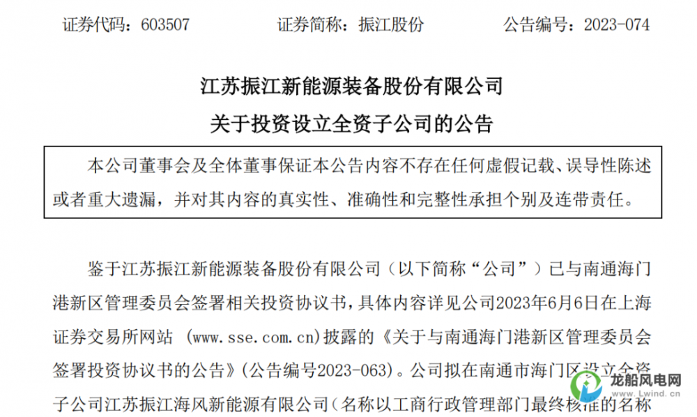 公告披露,振江股份拟在南通市海门区设立全资子公司江苏振江海风新能源有限公司(名称以工商行政管理部门最终核准的名称为准),注册资本为50,000万元人民币,经营范围包括:海洋风电塔架、钢管桩、导管架设计、制造、销售;海洋工程专用设备设计、制造、销售、安装等。