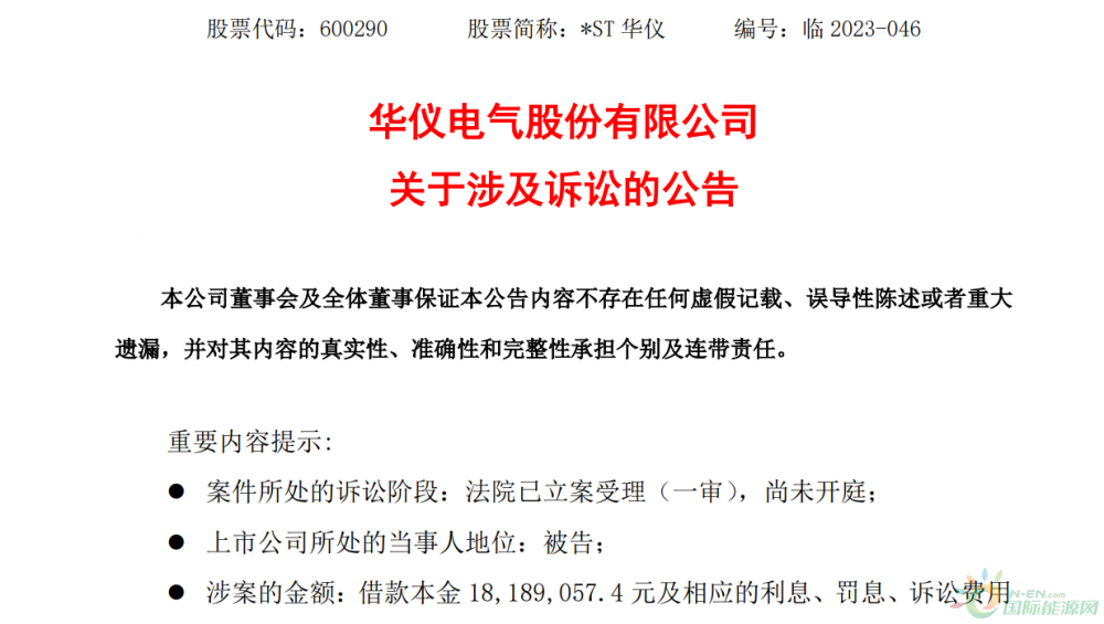 近日,华仪电气股份有限公司(以下简称“华仪电气”或“公司”)发布《关于涉及诉讼的公告》。