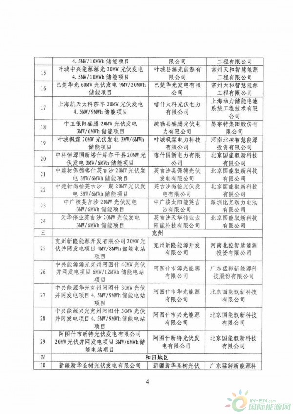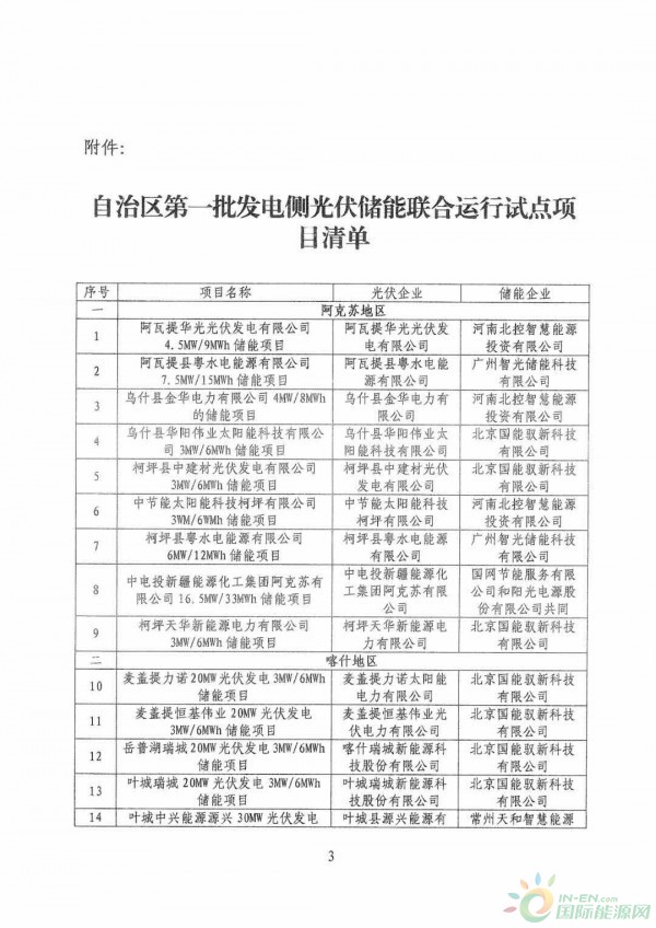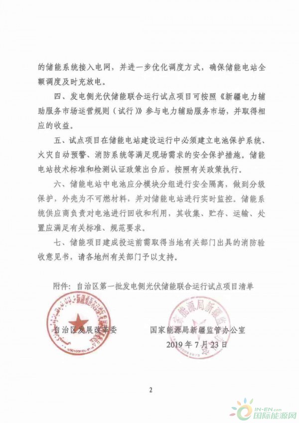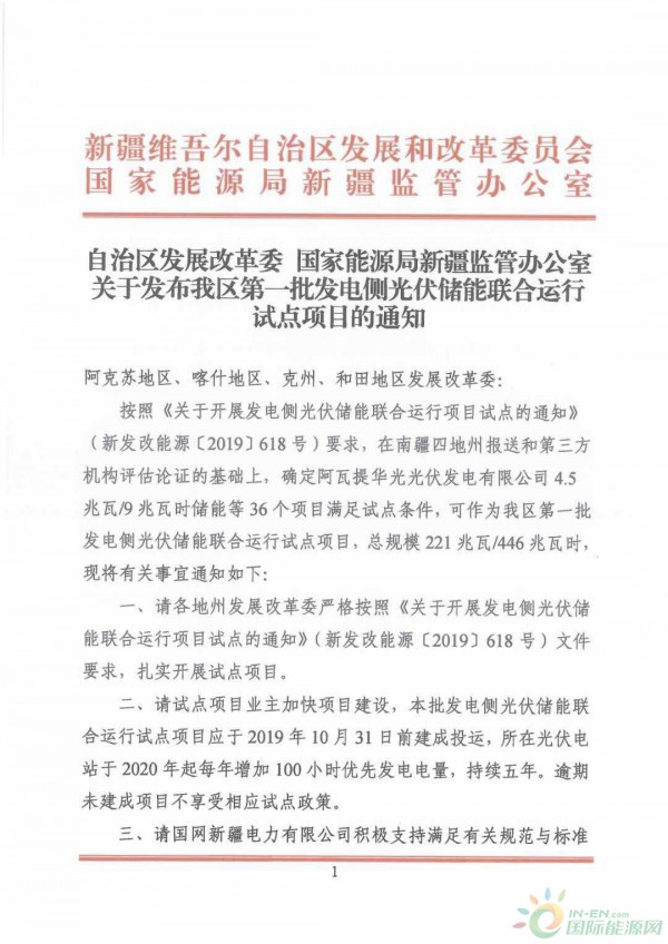 2019年7月23日,新疆发改委发布发布《新疆第一批发电侧光储联合运行试点项目清单》阳光电源、易事特、天合光能等十家公司获得首批36个光储项目资格,总规模为221MW/446MWh。