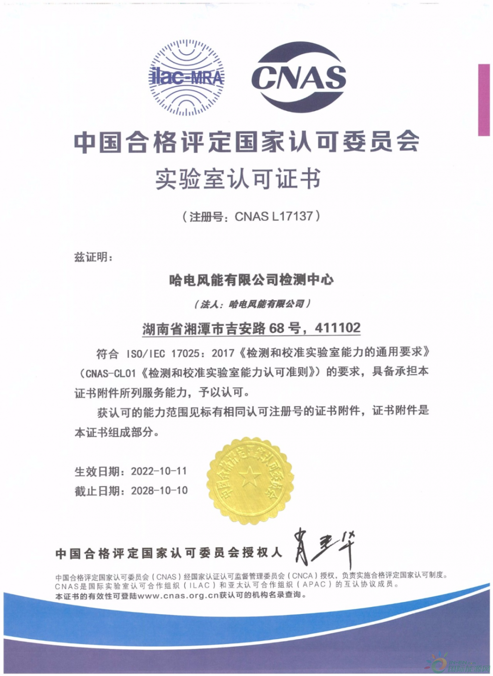 2022年10月,哈电风能有限公司(以下简称“哈电风能”)检测中心获得中国合格评定国家认可委员会(CNAS)颁发的实验室认可证书。