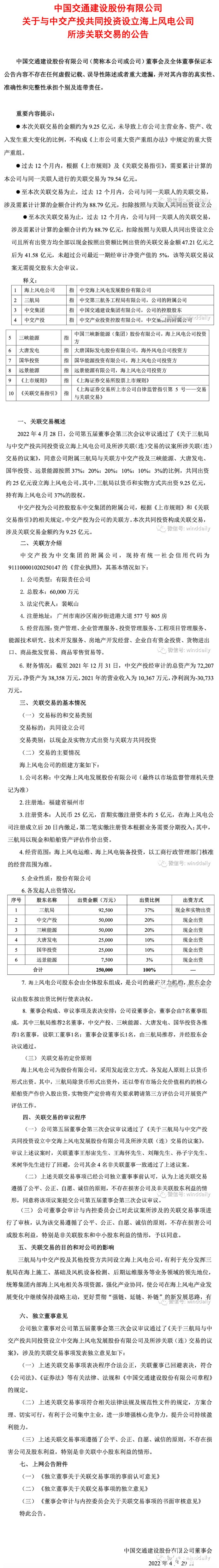 中国交通建设近日发布公告:三航局、中交产投、三峡能源、大唐发电、国华投资及远景能源订立发起人协议共同出资组建合资公司(中交海上风电发展股份有限公司)。根据发起人协议,合资公司的注册资本为人民币25亿元,其中,三航局、中交产投、三峡能源、大唐发电、国华投资及远景能源将分别出资9.25亿元,5亿元、5亿元、2.5亿元、2.5亿元及7500万元,以认购9.25亿股、5亿股、5亿股、2.5亿股、2.5亿股及7500万股合资公司股份分别占合资公司注册资本总额的37%、20%、20%、10%、10%及3%。