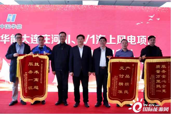 在12月30-31日举行的,华能大连庄河Ⅱ、Ⅳ1 海上风电项目全容量并网发电庆祝仪式上,中国华能向中国海装大连公司赠送了“产品精良、交付精准”、向中国海装工程公司赠送了“技术高超、服务一流”的锦旗,表达了项目业主对中国海装产品与服务的信任与认可。