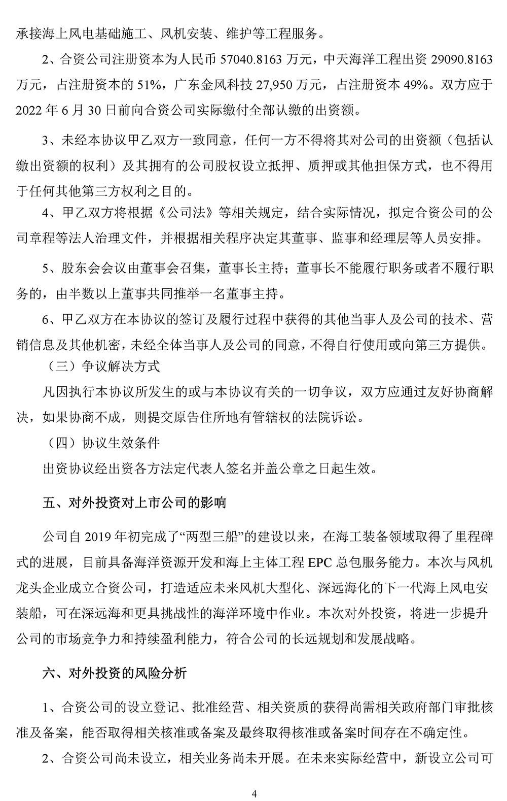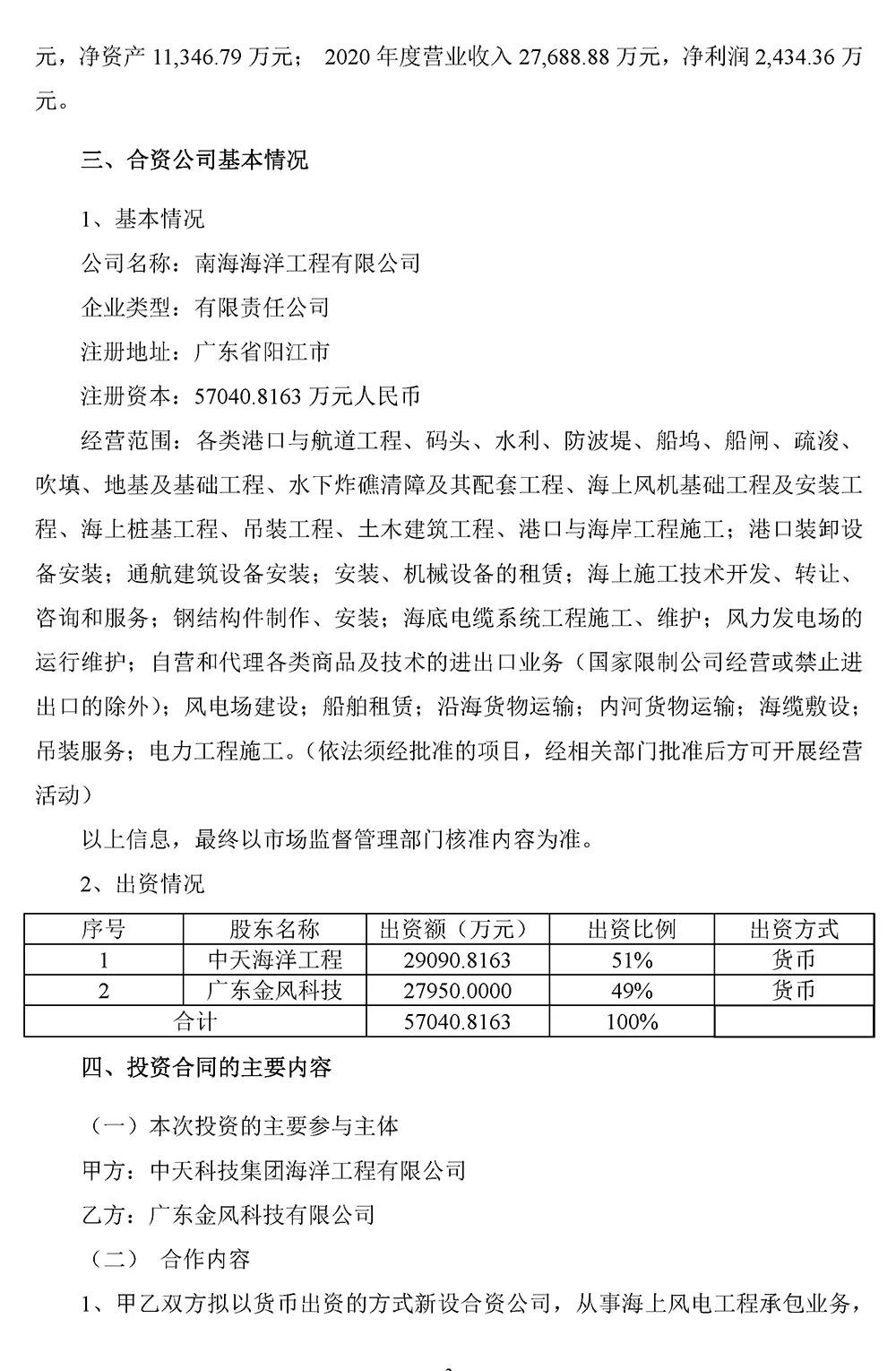 12月15日,中天科技发布公告,公司全资子公司中天海洋工程拟与广东金风科技共同出资设立南海海洋工程有限公司,从事海上风电工程承包业务,承接海上风电基础施工、风机安装、维护等工程服务,合资公司注册资本为57040.8163万元,中天海洋工程出资29090.8163万元,占注册资本的51%,广东金风科技出资27,950万元,占注册资本49%。