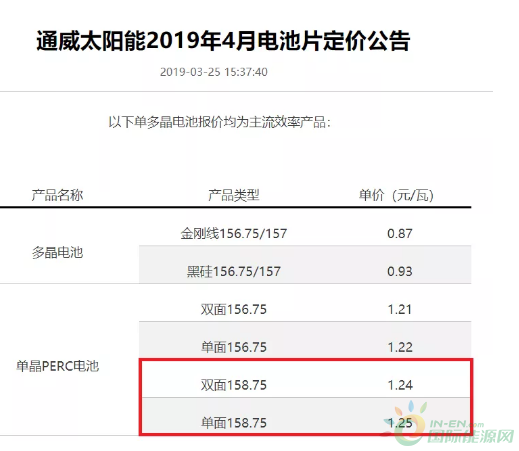 通威太阳能四月份电池片报价公告中首次把158.75mm规格的电池片单独罗列报价;