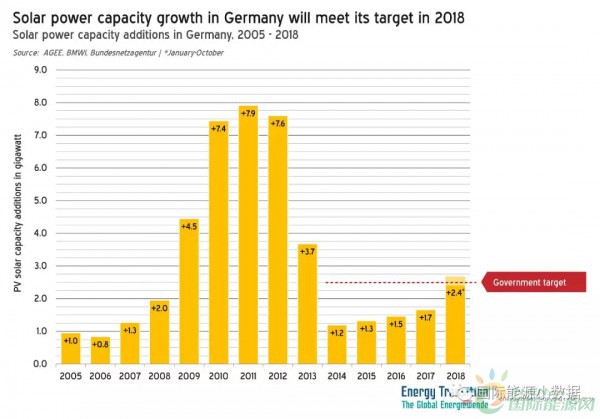 德国太阳能光伏曾经有过大跃进的年代,2009年新增装机4.5吉瓦,2010-2012年连续三年新增装机超过7吉瓦。此后,随着补贴政策的调整,德国政府为新增光伏设立了2.5吉瓦的目标,但是2014-2017年连续四年新增装机均低于2吉瓦。这一低迷状况终于在2018年得到改观,2018年1至10月德国光伏装机已经达到2.4吉瓦,全年达到2.5吉瓦已无悬念。截至10月底,德国自通过可再生能源法(EEG)以来累计安装的光伏发电容量已达到45.3吉瓦,而政府政策支持的光伏装机上限52吉瓦可望在2020年达到。