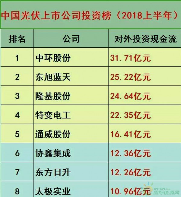 其中榜单前十名企业对外净投资规模都在10亿元以上,顺序依次为中环股份、东旭蓝天、隆基股份、特变电工、通威股份、协鑫集成、东方日升、太极实业、航天机电。