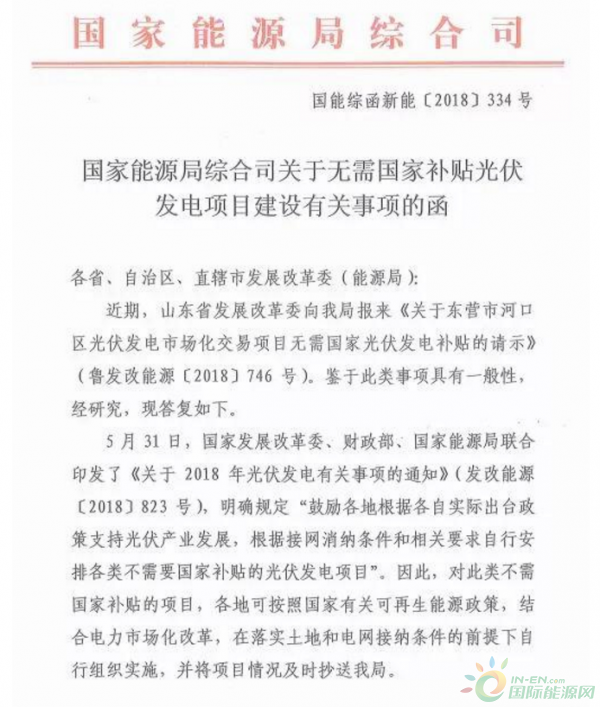 日前,国家能源局下发《关于无需国家补贴光伏发电项目建设有关事项的函》,鼓励各地根据各自实际出台政策支持光伏产业发展,根据接网消纳条件和相关要求自行安排各类不需要国家补贴的光伏发电项目,明确表示“对此类不需要国家补贴的项目,各地可按照国家有关可再生能源政策,结合电力市场化改革,在落实土地和电网接纳条件的前提下自行组织实施。”