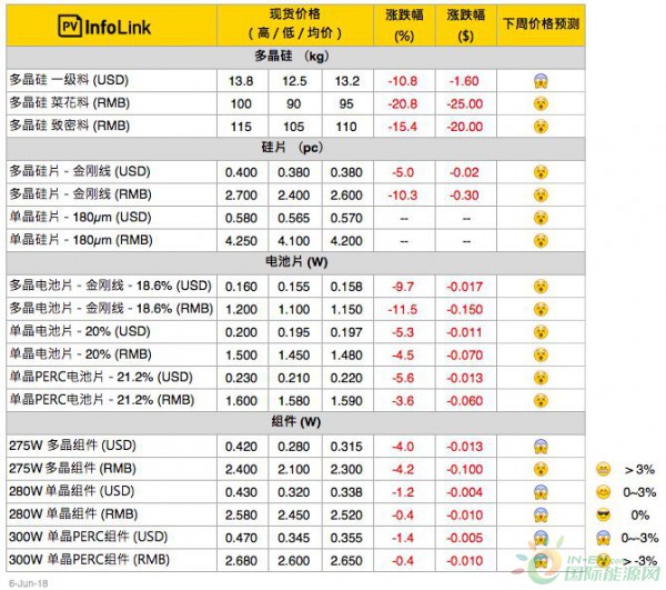 受823号文件的影响,本周上游各环节价格全线下跌!跌幅最大的为硅料环节!跌幅高达15%以上,菜花料价格直逼90元/kg! 多晶硅技术的硅片、电池片、组件跌幅较大; 相对而言,单晶硅技术由于未来有领跑者需求的支撑,跌幅相对较小。