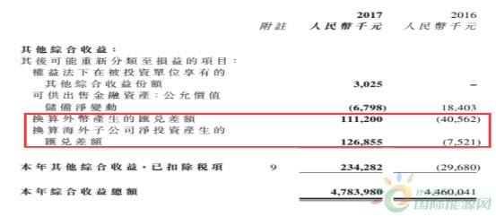 查询公司业绩报告发现,公司2017年换算外币产生的汇兑差额为正1.1亿元,上年同期则为负4045.2万元,此外公司换算海外子公司净投资产生的汇兑差额为1.27亿元,上年同期为负752.1万元。