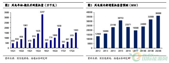 伴随着弃风现象的好转,风电新增装机量也有望重新回到上升通道中。数据显示,2017年中国国内全年新增并网风电装机15.03GW,累计并网容量163.67GW。根据海通证券研究所研究表明,预计2018年-2020年,中国新增装机量(吊装量)有望达到24GW、31GW和36GW。