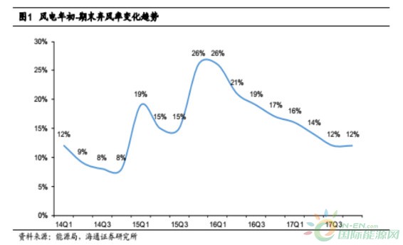 在政策的支持下,2017年电力行业弃风率得到明显改善,根据能源局发布的各年风电并网运行情况,2017年全年弃风率为12%,其中第四季度弃风率11.7%,弃风率处在较为平稳的下滑趋势中。