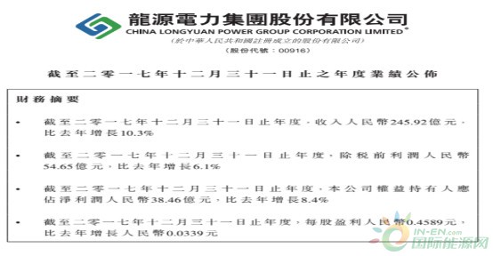 于2017年全年,龙源电力实现收入人民币245.92亿元(单位下同),同比增长10.3%。除税前利润54.65亿元,比去年增长6.1%。公司权益持有人应占净利润38.46亿元,比去年增长8.4%。每股盈利0.46元。