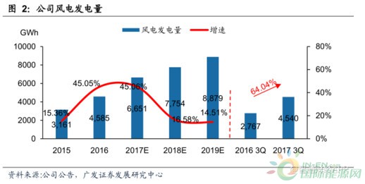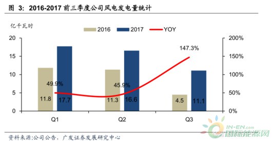 2017年第三季度,公司风电业务实现发电量11.1亿千瓦时,同比增长147.28%,高于预期。截止2017年9月,公司风电累计发电量45.4亿千瓦时,较去年同期增长64.04%。