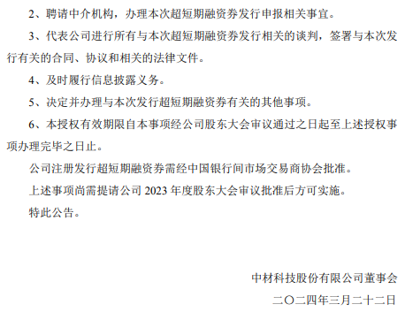 国际能源网获悉,3月22日,中材科技股份有限公司(简称:中材科技)发布关于申请注册发行不超过48亿元超短期融资券的公告。
