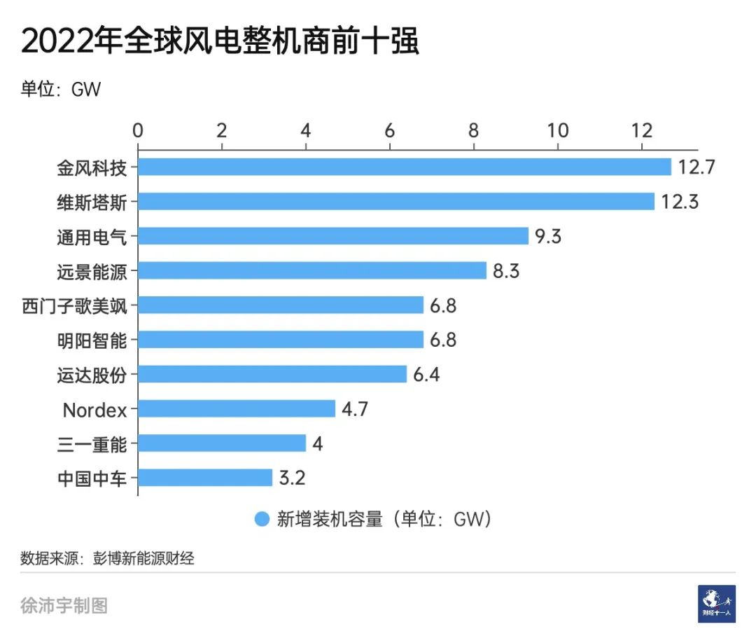 金风科技的海外市场占比是中国风电企业里最大的。据彭博新能源财经统计,2022年金风科技取代维斯塔斯,登顶风电整机制造商新增吊装容量榜首。金风科技年报显示,2022年海外市场订单占公司全部订单的比重为16.5%。