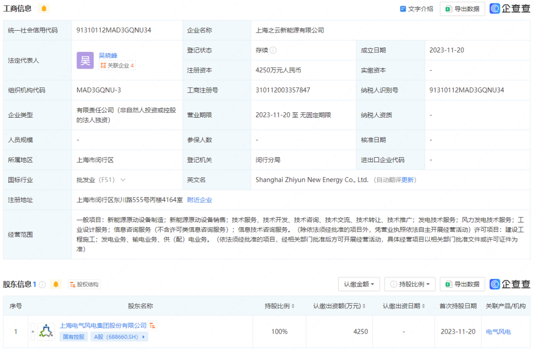 近日,上海之云新能源有限公司成立,法定代表人为吴晓峰,注册资本4250万元,经营范围含新能源原动设备制造、新能源原动设备销售、风力发电技术服务、信息咨询服务、建设工程施工等。股东信息显示,该公司由电气风电全资持股。