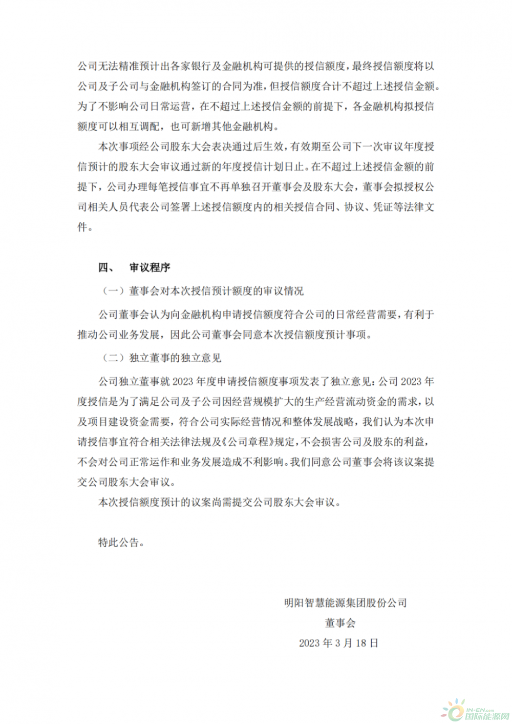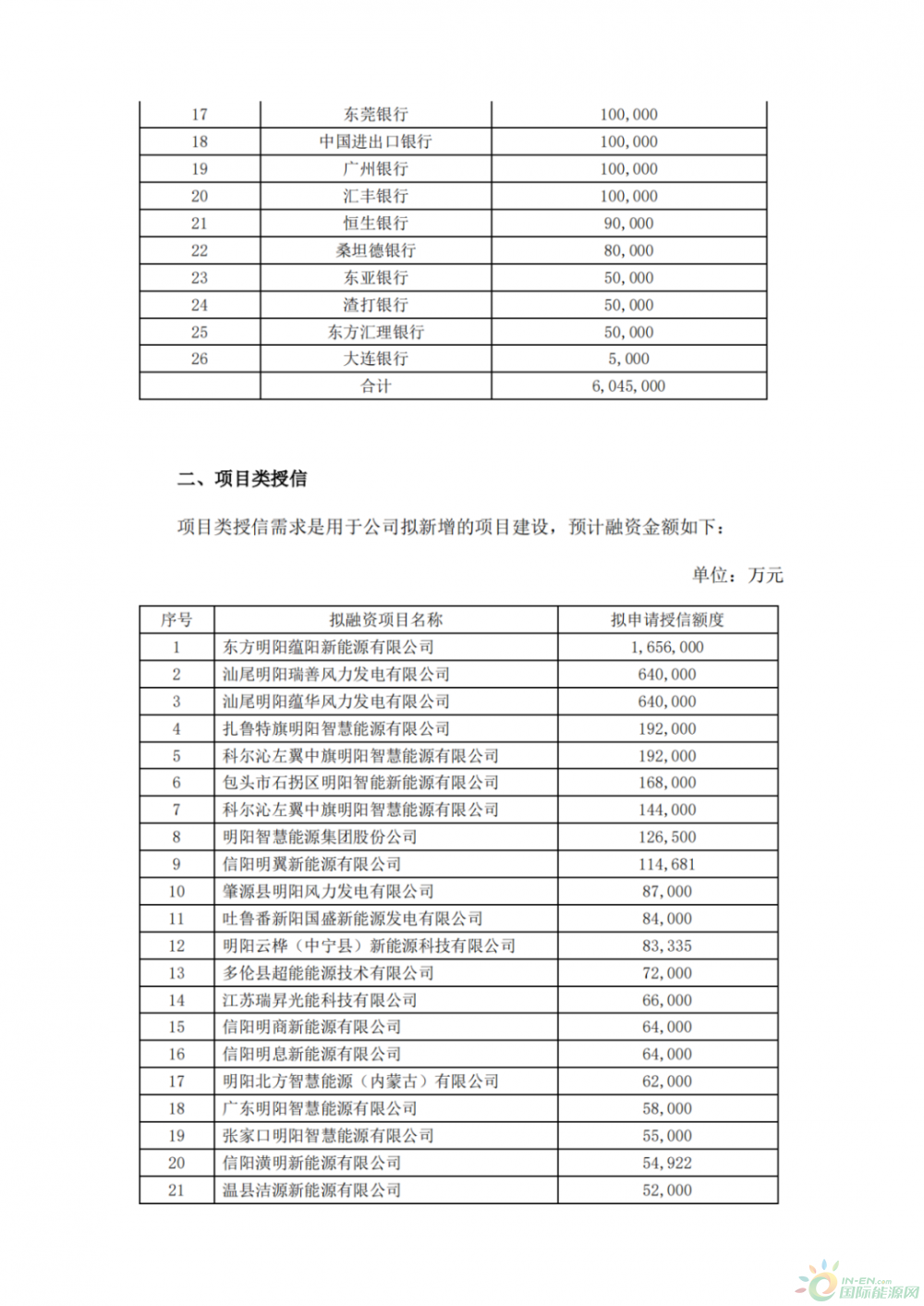 3月20日,明阳智能发布公告称明阳智能及各子公司根据日常经营及业务发展需要,2023年度拟向银行、金融机构以及其他金融业申请不超过人民币11572062万元授信额度,其中:经营类授信人民币6045000万元;项目类授信人民币5527062万元。